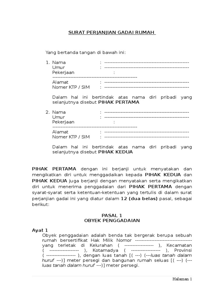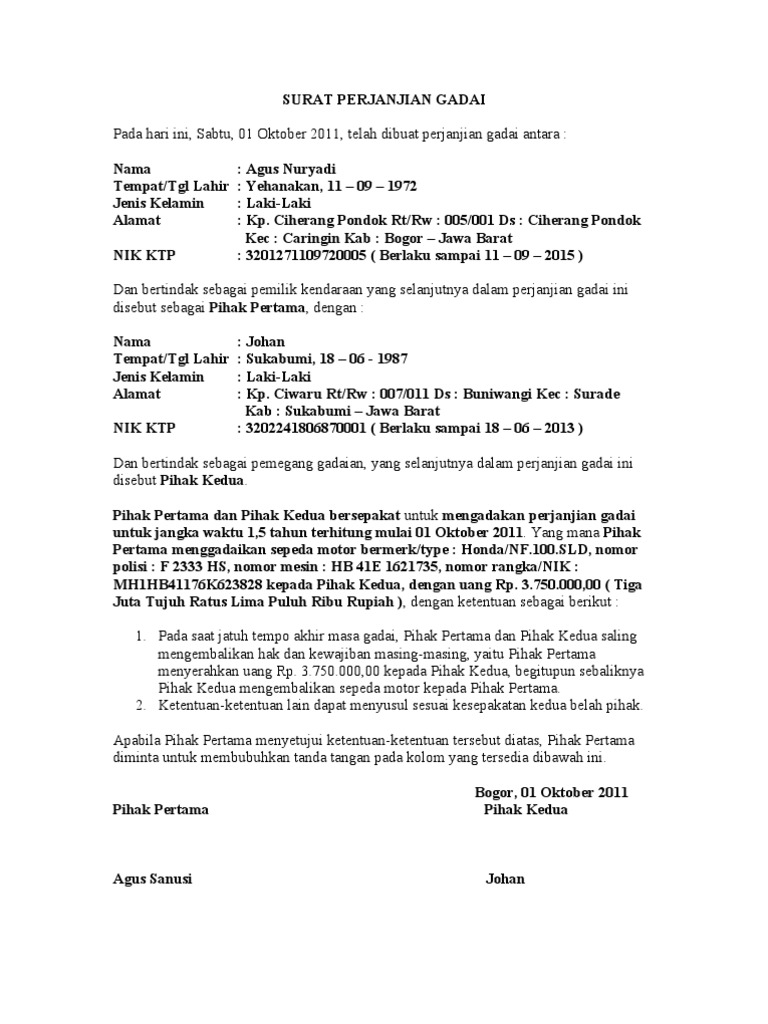 Oct 11, 2013 · pasal 1155 kuhper: Feb 28, 2020 · mulai dari surat perjanjian jual beli tanah surat perjanjian sewa mobil hingga surat perjanjian hutang. Oct 21, 2016 · perjanjian gadai merupakan perjanjian accesoir yakni perjanjian selalu bersandar pada perjanjian pokok yang berupa perjanjian pinjam meminjam uang. Jun 18, 2020 · contoh hak seperti ini adalah hak gadai tanah, hak usaha bagi hasil, hak sewa tanah pertanian, dan hak menumpang. 4 tahun 2016 tentang pemberlakuan rumusan hasil rapat pleno kamar mahkamah agung tahun 2016 sebagai pedoman pelaksanaan tugas bagi pengadilan (sema 4/2016) secara khusus menjawab permasalahan ini yang diatur dalam bagian b rumusan hukum kamar perdata, perdata umum angka 7 sema 4/2016, berbunyi sebagai berikut: